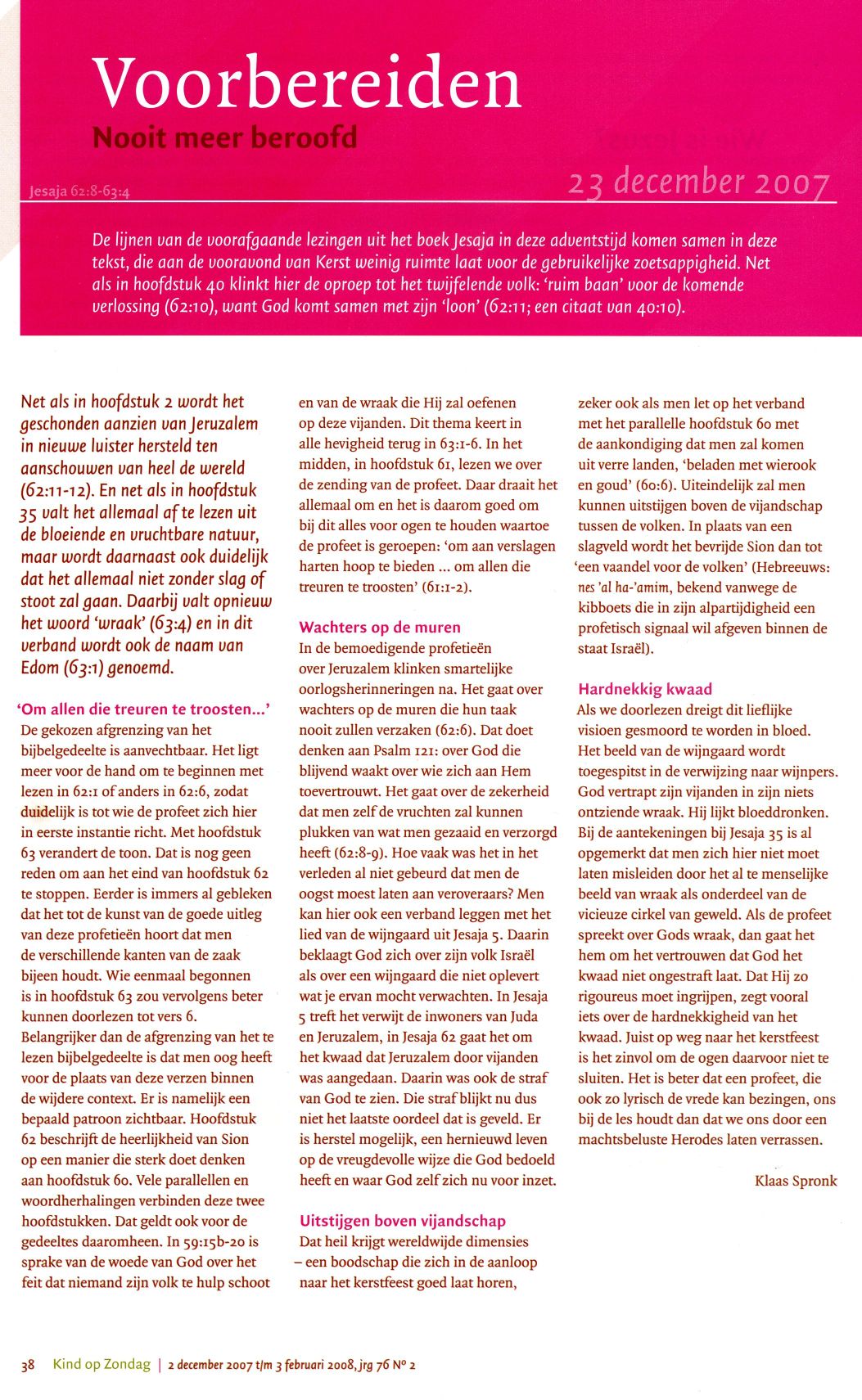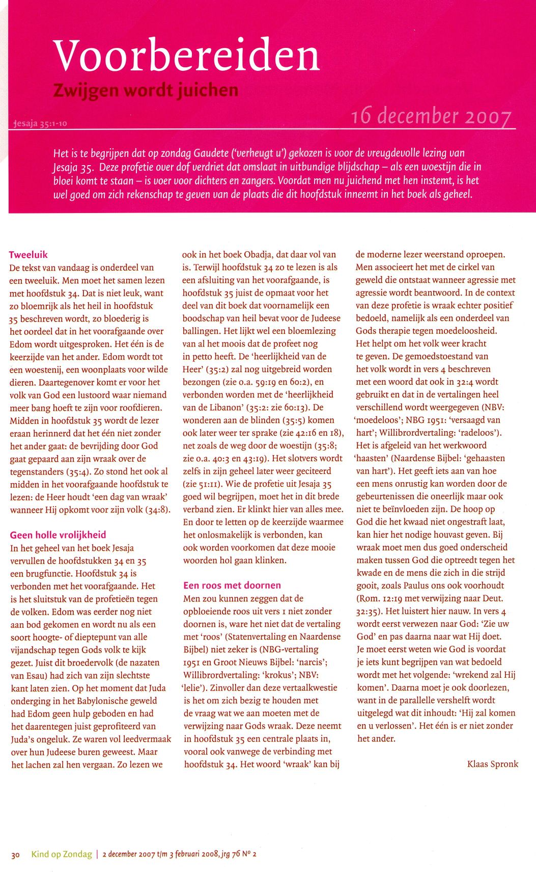 Zojuist heb ik mijn lijst van publicaties aangevuld. Het aardige is dat die nu begint en eindigt met de vermelding van stukjes die ik schreef voor tijdschriften met materiaal voor de kerkdienst. In 1980 begon ik als student mee te werken aan De eerste dag. Dat heb ik tien jaar gedaan. Van 1993 tot 2003 heb ik geschreven voor Kind en Zondag (later Kind op zondag). Voor de Adventsperiode van dit jaar was ik uitgenodigd als gastschrijver en heb ik exegetische bijdragen geschreven bij de oudtestamentische lezingen uit het Lutherse rooster: Jes. 40:1-11; 2:2-5; 35:1-10 en 62:8-63:4. In academische kringen “scoor” je daar niet mee. Wat telt zijn wetenschappelijke artikelen in gerenommeerde tijdschriften die werken met kritische “reviewers”. Ik waag me ook wel in dat circuit, maar ik heb me voorgenomen dat alleen te doen als ik iets interessants te melden heb. Dat lijkt voor de hand te liggen, maar ik kan me niet aan de indruk onttrekken dat veel collega’s in de eerste plaats publiceren om zichzelf te presenteren. Voor velen is het “publish or perish”. Die druk voel ik niet zo. Ik heb het dan ook veel makkelijker bijvoorbeeld dan mijn vakgenoten in Zuid-Afrika. Zij krijgen betaald voor hun wetenschappelijke publicaties. En bij hun salaris hebben ze dat hard nodig.