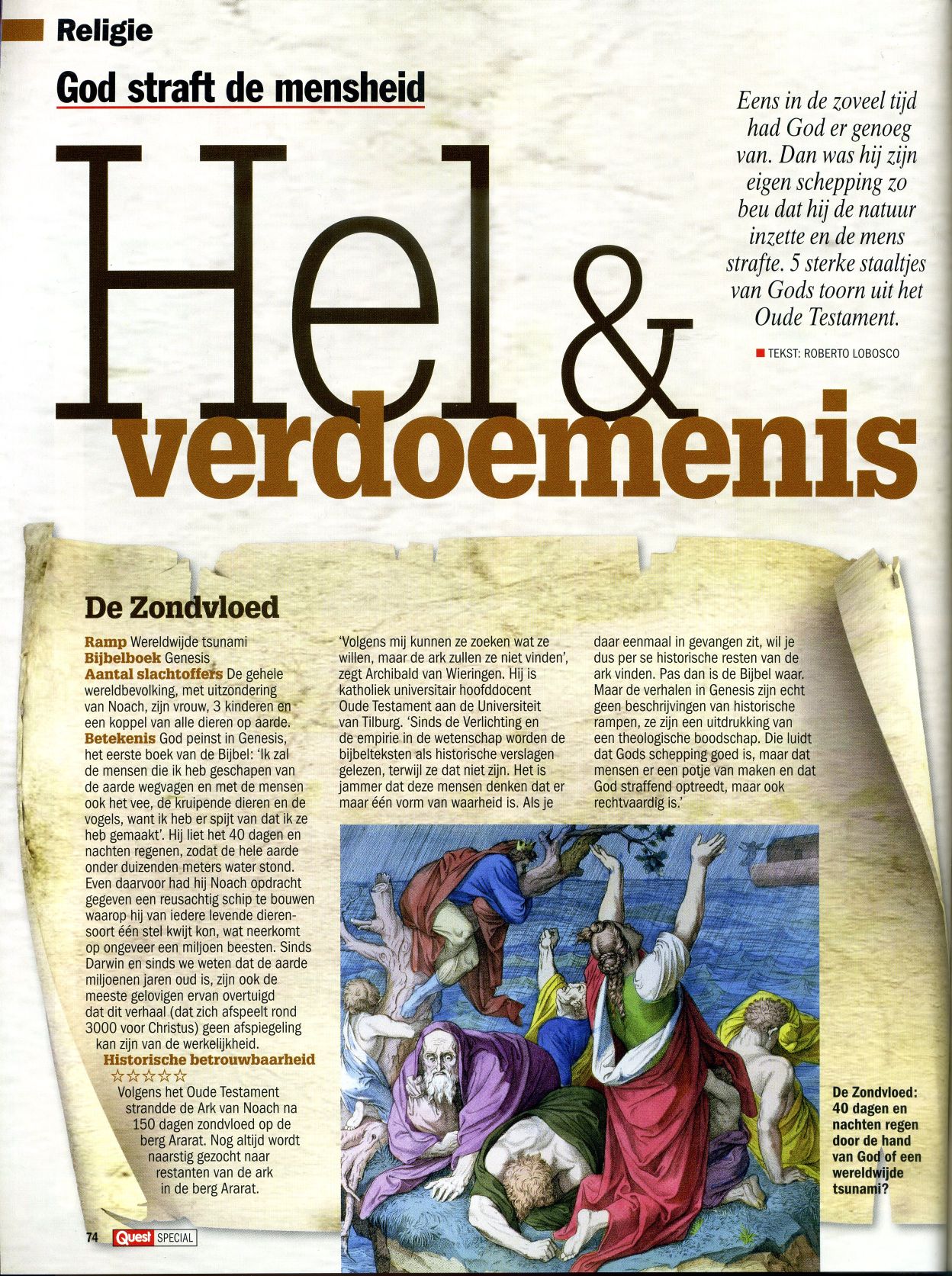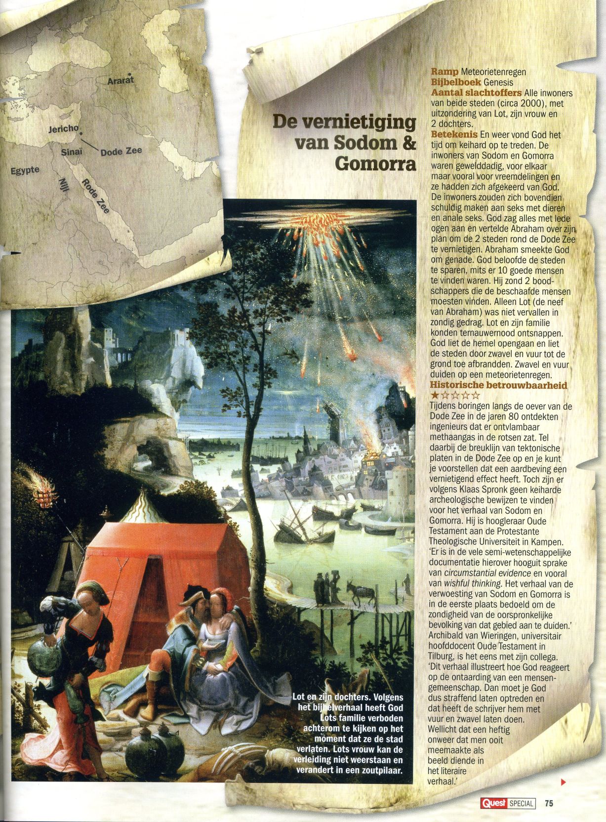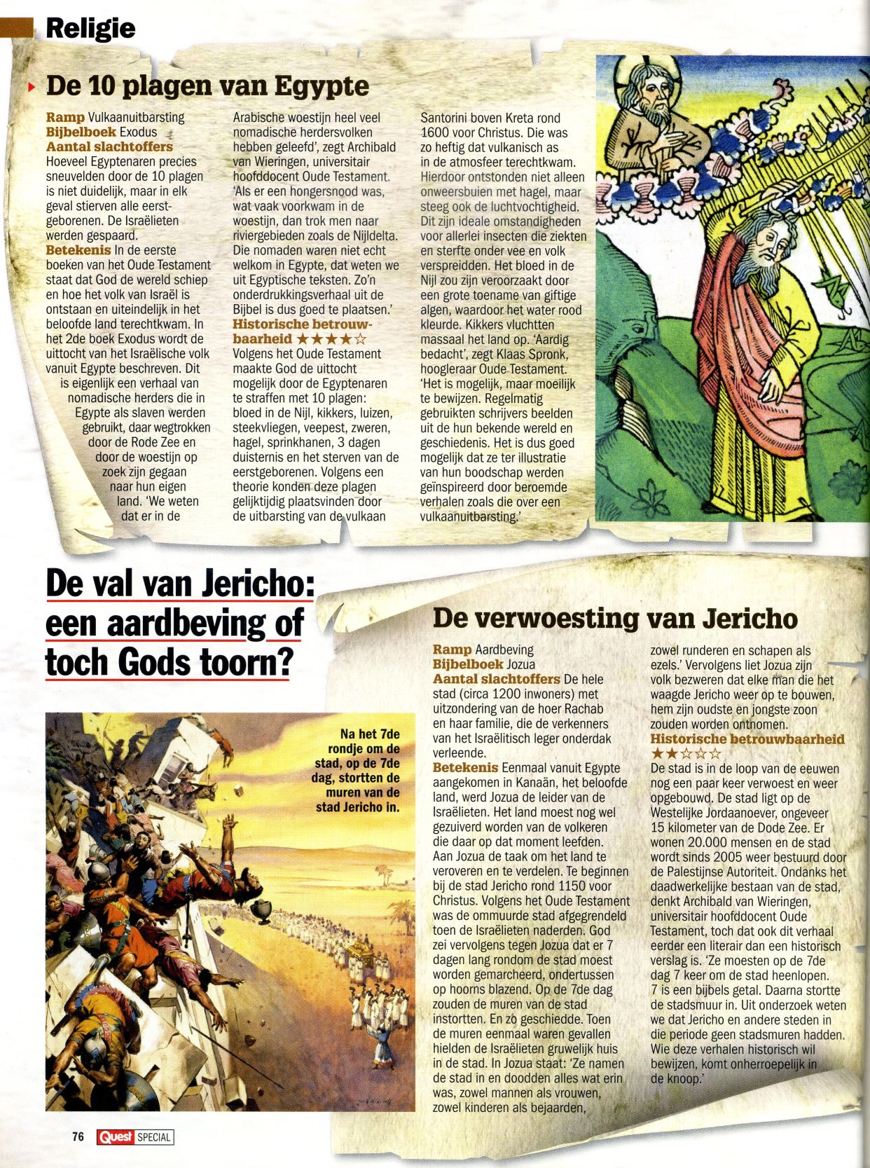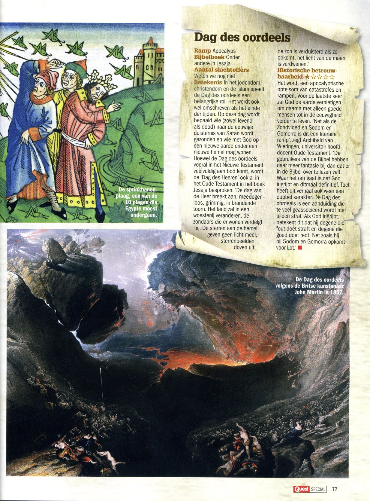 Onlangs viel mij de eer te beurt dat ik door een redacteur van het tijdschrift Quest benaderd werd om als deskundige antwoord te geven op een aantal brandende vragen over rampen in de Bijbel. Dat was onderdeel van zijn research voor een bijdrage aan een themanummer over rampen. Hij stuurde mij via e-mail een aantal vragen toe. Die heb ik per ommegaande vrij uitgebreid beantwoord. Het resultaat is te lezen in het nummer dat onlangs verscheen. In 1, 2, 3, 4 bladzijden worden kort en vooral ook fraai geïllustreerd de grootste in de Bijbel beschreven rampen besproken. Het blijkt daarbij vooral te gaan om de vraag naar de historische betrouwbaarheid. Dat is mijns inziens niet de meest relevante vraag. Dat had ik ook duidelijk aangegeven, maar die boodschap was niet overgenomen. Nou ja, het is leuk om in zo’n tijdschrift als deskundige opgevoerd te worden. En het is ook geen ramp dat het tot twee kleine citaten beperkt is gebleven.